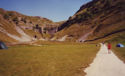 | Gordale Scar (1999) Wij proberen naar boven te klimmen | Gordale Scar (1999) Met onze rugzakken aan had dit nooit gelukt |